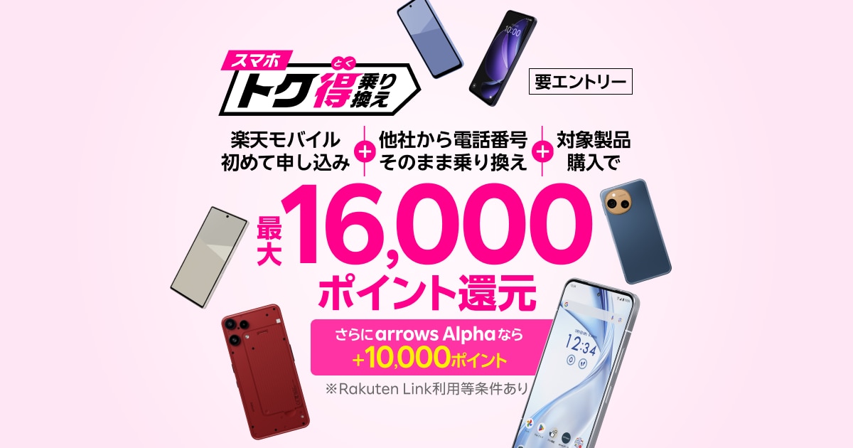 スマホトク得乗り換え!Android製品が最大16,000ポイント還元! | キャンペーン・特典 | 楽天モバイル