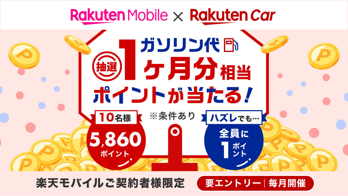 【楽天モバイルご契約者様限定】毎月開催!楽天Carアプリからエントリーすると抽選で最大ガソリン代1ヶ月分相当のポイントが当たる!