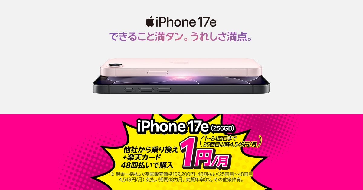 最新のiPhone 17eが他社から電話番号そのまま乗り換え+48回払い(買い替え超トクプログラム)で1円/月~! | キャンペーン・特典 | 楽天モバイル